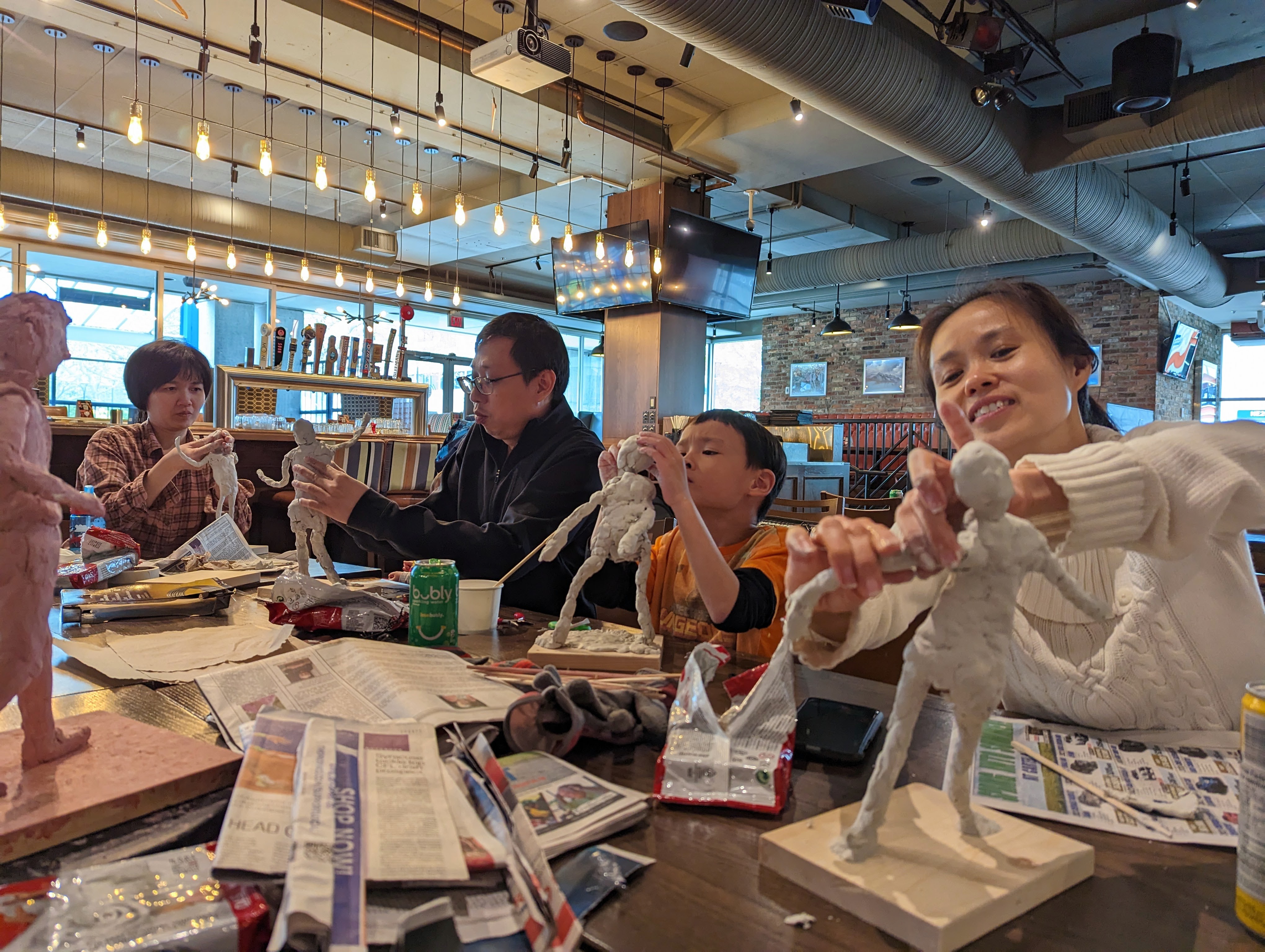 Intense fun, intense learning! Fahcheong held a small intimate workshop in modelling yesterday. There were 10 participants, age ranging from young kids to seniors, all new to the art of making figures in clay. It was a seemingly simple exercise — start with a piece of wire, make a few curls for the head then turn your wire down for the body, do the pelvis and the legs and so on until you finally have the skeleton of your figure. Next using paper and clay, fill in the details. In that fashion, the hours flew by as everyone got immersed in what each was doing.