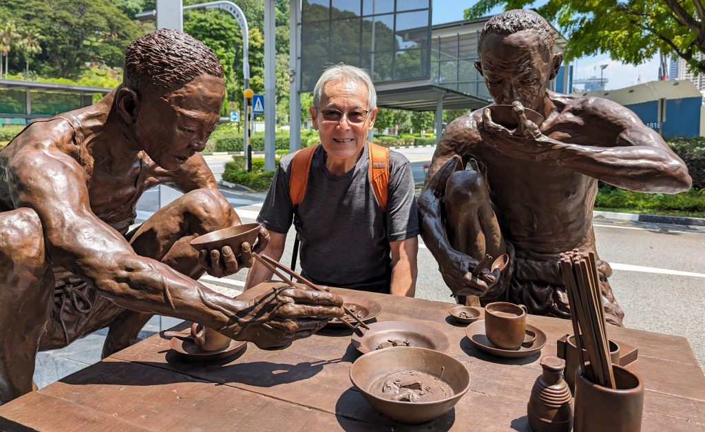 The coolies had been sitting outside Fort Canning MRT station for a few months. And that one day in November 2024 it was a typical very hot Singapore afternoon; the sun was blazing down unimpeded by a single cloud in the sky, the heat was intense. But the coolies were unfazed. It was just Another Day in the lives of these dockside labourers, except that day they had a surprise visit from none other than CFC himself who had come by to see how comfortable they were in their now-permanent home. Also that day, a young Indian tourist from Mumbai and his mother were taking some photos with the coolies. Pleased that his sculpture was receiving such attention, Fahcheong chatted with the young boy about the intricacies of sculpture making. Both mother and son were pleased to have met the sculptor and later went on their way with a unique souvenir experience of Singapore.